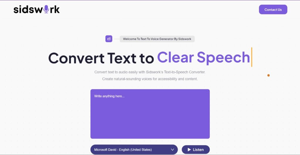 Convert text into realistic, human-like speech. Ideal for audiobooks, podcasts, and professional narrations with Sidswork‘s Text to Voice.